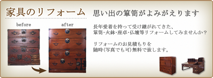 近年はリサイクル意識の向上と共に、古いものの良さが見直され、家庭、旅館などで 長年愛着を持って受け継がれている箪笥、家具、仏具等を再生のために持ち込まれる方も増えております。 当組合による丁寧な修繕、高度な塗装技術により再び蘇り、お客様に好評をいただいております。